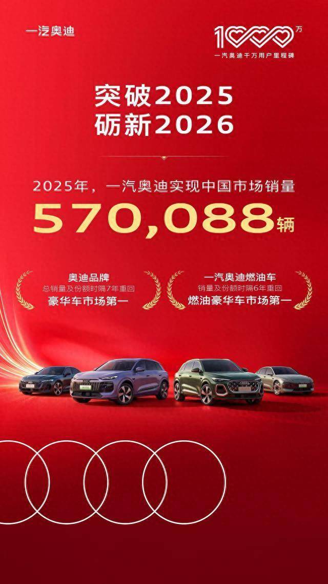 2025年的国内豪华汽车市场,智能化正在重塑行业格局,燃油车市场面临结构性承压,在此背景下,一汽奥迪凭借精准战略布局、产品技术革新与体系能力升级,交出了一份逆势增长的答卷,全年中国市场销量达到零售570,088辆,燃油车销量及份额时隔6年重返燃油豪华车市场第一,国产燃油车销量及份额稳居国产燃油豪华车市场榜首。至此,奥迪品牌总销量及市场份额强势攀升,时隔七载重返豪华车市场榜首。